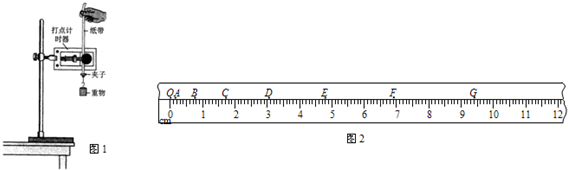 ②打点计时器接在频率为50Hz的交流电源上,图2为实验中打出的一条纸带,从起始点O开始,将此后连续打出的7个点依次标为A、B、C、D….打点计时器打F点时,重物下落的速度为______m/s,该重物下落的加速度为______m/s2.(结果保留两位有效数字)