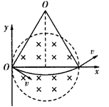 3、计算题 如图所示,质量为m,电荷量为e的电子从坐标原点O处沿xOy平面射入第一象限内,射入时的速度方向不同,但大小均为v0.现在某一区域内加一方向向外且垂直于xOy平面的匀强磁场,磁感应强度大小为B,若这些电子穿过磁场后都能垂直地射到与y轴平行的荧光屏MN上,求: