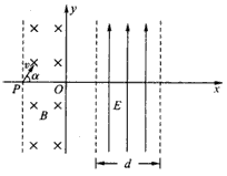 4、计算题 如图所示,直角坐标系xOy位于竖直平面内,在的区域内有磁感应强度大小B=4.0×10-4T、方向垂直于纸面向里的条形匀强磁场,其左边界与x轴交于P点;在x>0的区域内有电场强度大小E=4 N/C、方向沿y轴正方向的条形匀强电场,其宽度d=2 m。一质量m=6.4×10-27 kg、电荷量q=-3.2×10-9 C的带电粒子从P点以速度v=4×104m/s,沿与x轴正方向成α=60°角射入磁场,经电场偏转最终通过x轴上的Q点(图中末标出),不计粒子重力,求:
