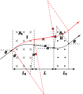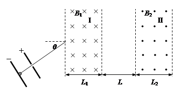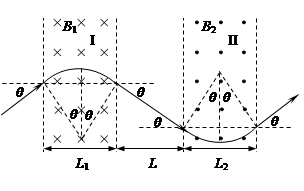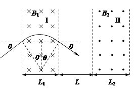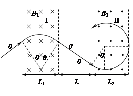(4)若L1≠L2,B1≠B2,且已保证粒子能从II区域的右边界射出,为使粒子从II区域右边界射出时速度与从I区域左边界射入时的方向总相同,求B1、B2、L1、L2之间应满足的关系式。