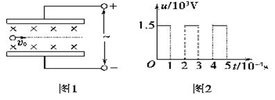 1、计算题 (9分) 如图所示,两块水平放置的平行金属板板长L=1.4m,板距d=30cm,两板间有B=1.25T、垂直纸面向里的匀强磁场。在两板上加如图2所示的脉动电压。在t=0时,质量m=2×10-15kg、电荷量q=1×10-10C的正离子,以速度v0=4×103m/s从两板中间水平射入,试问: