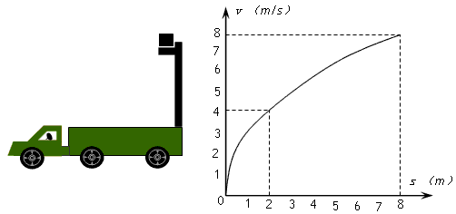 5、计算题  汽车以1.6m/s的速度在水平地面上匀速行驶,汽车后壁货架上放有货物(可视作质点),架高1.8m。由于前方事故,突然急刹车,汽车轮胎抱死,货物从架上落下。已知该型号汽车在所在路面行驶时刹车痕s (即刹车距离)与刹车前车速v的关系如下图线所示,忽略货物与架子间的摩擦及空气阻力,g取10m/s2。求: