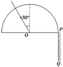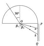 4、简答题 如图10所示,半圆形玻璃砖的半径为R,光屏PQ置于直径的右端并与直径垂直,一复色光与竖直方向成α=30°角射入玻璃砖的圆心,由于复色光中含有两种单色光,故在光屏上出现了两个光斑,玻璃对这两种单色光的折射率分别为n1=