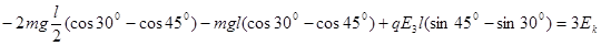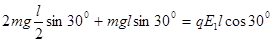 5、计算题 (14分)如图,一对很大的竖直放置的平行金属板可以绕M、N左右转动,其之间存在一水平匀强电场。有一长为l的轻质细绝缘棒OA.处于电场中,其一端可绕O点在竖直平面内自由转动,另一端A.处固定一带电-q、质量为m的小球A.,质量为2m的绝缘不带电小球b固定在OA.棒中点处。滑动变阻器电阻足够大,当变阻器滑片在P点处时,棒静止在与竖直方向成30°角的位置,已知此时BP段的电阻为R,M、N两点间的距离为d。试求:(重力加速度为g)