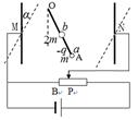5、计算题 (14分)如图,一对很大的竖直放置的平行金属板可以绕M、N左右转动,其之间存在一水平匀强电场。有一长为l的轻质细绝缘棒OA.处于电场中,其一端可绕O点在竖直平面内自由转动,另一端A.处固定一带电-q、质量为m的小球A.,质量为2m的绝缘不带电小球b固定在OA.棒中点处。滑动变阻器电阻足够大,当变阻器滑片在P点处时,棒静止在与竖直方向成30°角的位置,已知此时BP段的电阻为R,M、N两点间的距离为d。试求:(重力加速度为g)