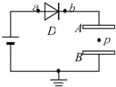 1、选择题 如图所示,D是一只理想二极管,电流只能从a流向b,而不能从b流向a0.平板电容器的A、B两极板之间有一电荷,在P点处于静止状态.以φp表示P点的电势,U表示两极板间电压,EP表示电荷在电场中的电势能.若保持极板B不动,将极板A稍向上平移,则下列说法中正确( )
