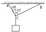 4、计算题 轻绳的两端A、B固定在天花板上,绳能承受的最大拉力为120N。现用挂钩将一重物挂在绳子的结点C处。如图所示,两端与竖直方向的夹角分别为37°和53°。求: