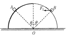 2、选择题 如图所示,固定的半球面右侧是光滑的,左侧是粗糙的,O点为球心,A、B为两个完全相同的小物块(可视为质点),小物块A静止在球面的左侧,受到的摩擦力大小为F1,对球面的压力大小为N1;小物块B在水平力F2作用下静止在球面的右侧,对球面的压力大小为N2,已知两小物块与球心连线和竖直方向的夹角均为θ,则