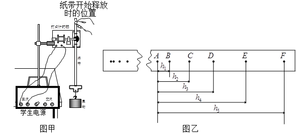 ③ 该同学经正确操作得到如图乙所示的纸带,取连续的六个点A、B、C、D、E、F为计数点,测得点A到B、C、D、E、F的距离分别为h1、h2、h3、h4、h5,若打点的时间间隔为T,则打E点时重物速度的表达式为vE=