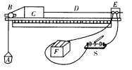 3、实验题 如图所示是某次利用气垫导轨探究加速度与力、质量关系,在装置安装完毕后、闭合电路开关前的示意图。图中A为沙桶和沙,B为定滑轮,C为滑块及上面添加的砝码,D为纸带,E为电火花计时器,F为蓄电池(电动势为6V),S为开关,请指出图中的三处错误:
