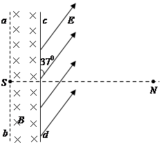 2、计算题 (12分)如图所示,真空室内存在宽度为d=8cm的匀强磁场区域,磁感应强度B=0.332T,磁场方向垂直于纸面向里;ab、cd足够长,cd为厚度不计的金箔,金箔右侧有一匀强电场区域,电场强度E=3.32×105N/C;方向与金箔成37°角.紧挨边界ab放一点状α粒子放射源S,可沿纸面向各个方向均匀放射初速率相同的α粒子,已知:α粒子的质量m=6.64×10 27kg,电荷量q = 3.2×10 19C,初速度v = 3.2×106m/s。(sin37°= 0.6,cos37°= 0.8)求:
