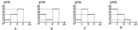 5、选择题 质量为1 kg的物体静止在水平面上,物体与水平面之间的动摩擦因数为0.2。现对物体施加一个大小变化、方向不变的水平拉力F,使物体在水平面上运动。力F随时间的变化情况如图所示,为使物体在这3s内发生的位移最大,力F的变化情况应为图中的
