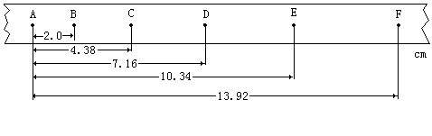 4、实验题 (10分)如图所示为某同学在一次实验中用打点计时器打出的一条纸带,其中ABCDEF是打点计时器连续打出的6个点,该同学用毫米刻度尺测量A点到各点的距离,并记录在图中(单位:cm)则: