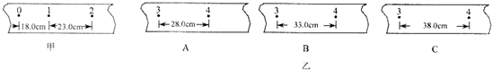 1、填空题 某同学在测定匀变速运动的加速度时,得到了一条较为理想的纸带,已知纸带上每5个打点取一个计数点,即两计数点之间的时间间隔为0.1s,依打点先后编为0、1、2、3、4、5…,由于不小心,纸带被撕断了,如图所示,甲图所示纸带是计数点的初始段,则乙图中A,B、C所示的三段纸带中是从甲图所示的纸带上撕下的那段应该是______(填字母);打这条纸带时,纸带运动的加速度大小是______m/s2.