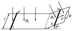 1、作图题 如图所示,两条间距l=1 m的光滑金属导轨制成倾角37°的斜面和水平面,上端用阻值为R=4 Ω的电阻连接.在斜面导轨区域和水平导轨区域内分别有垂直于斜面和水平面的匀强磁场B1和B2,且B1=B2=0.5 T.ab和cd是质量均为m=0.1 kg,电阻均为r=4 Ω的两根金属棒,ab置于斜面导轨上,cd置于水平导轨上,均与导轨垂直且接触良好.已知t=0时刻起,cd棒在外力作用下开始水平向右运动(cd棒始终在水平导轨上运动),ab棒受到F=0.6-0.2t(N)沿斜面向上的力作用,处于静止状态.不计导轨的电阻.