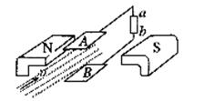 2、选择题 目前世界上正研究的一种新型发电机叫磁流体发电机,如图所示表示它的发电原理:将一束等离子体(即高温下电离的气体,含有大量带正电和负电的粒子,而从整体来说呈中性)沿图中所示方向喷射入磁场,磁场中有两块金属板A、B,这时金属板上就聚集了电荷.在磁极配置如图中所示的情况下,下述说法正确的是(?)