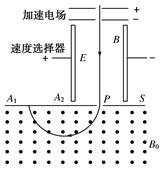 4、选择题 如下图是质谱仪的工作原理示意图.带电粒子被加速电场加速后,进入速度选择器.速度选择器内相互正交的匀强磁场和匀强电场的强度分别为B和E.平板S上有可让粒子通过的狭缝P和记录粒子位置的胶片A1A2.平板S下方有强度为B0的匀强磁场.下列表述正确的是