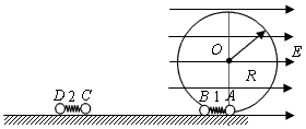 5、计算题 如图所示,固定的光滑水平绝缘轨道与半径为R=0.2m、竖直放置的光滑绝缘的圆形轨道平滑连接,圆形轨道处于电场强度大小为,方向水平向右的匀强电场中。光滑水平绝缘轨道上有A、B、C、D四个可看作为质点的小球,已知mA=mD=0.1kg,mB=mC=0.2kg,A球带正电,电量为q,其余小球均不带电。小球C、D与处于原长的轻弹簧2连接,小球A、B中间压缩一轻且短的弹簧(弹簧弹力足够大),轻弹簧与A、B均不连接,在圆轨道的最低点由静止释放A、B后,A球在圆轨道运动时恰能做完整的圆周运动,B被弹开后与C小球碰撞且粘连在一起,设碰撞时间极短。g取10m/s2。试求: