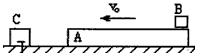 2、计算题 如图所示,长为0.60m的木板A,质量为1kg,板的右端放有物块B,质量为3kg,它们一起在光滑水平面上向左匀速运动,速度,以后木板A与等高的竖直固定档板C发生碰撞,碰撞时间极短,且碰撞时没有机械能损失,物块B与木板A间的动摩擦因数0.4,取重力加速度