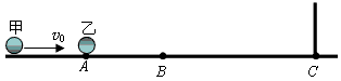 1、计算题 光滑的水平面上,质量为m1的小球甲以速率v0向右运动。在小球甲的前方A点处有一质量为m2的小球乙处于静止状态,如图所示。甲与乙发生正碰后均向右运动。乙被墙壁C弹回后与甲在B点相遇,。已知小球间的碰撞及小球与墙壁之间的碰撞均无机械能损失,求求甲、乙两球的质量之比
