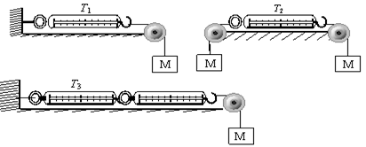 3、选择题 在下图所示的三种情况中,砝码的质量均为M,不计一切摩擦和弹簧秤的重力,则三个弹簧秤的示数