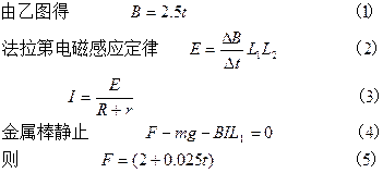 (1)若金属棒距导轨下端L2=0.2m,磁场随时间变化的规律如图乙所示,为保持金属棒静止,试求加在金属棒中央、沿竖直方向的外力随时间变化的关系;