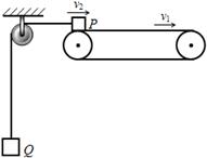 5、选择题 如图所示,水平传送带以速度v1匀速运动,小物体P、Q由通过定滑轮且不可伸长的轻绳相连,t = 0时刻P在传送带左端具有速度v2,P与定滑轮间的绳水平,t = t0时刻P离开传送带。不计定滑轮质量和摩擦,绳足够长。正确描述小物体P速度随时间变化的图象可能是(?)