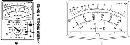 【小题4】将红、黑表笔分别与待测电阻两端相接触,若电表读数如下图乙所示,该电阻的阻值为 Ω。
