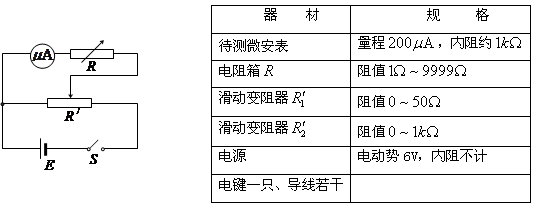 1、实验题 (10分)为较精确地测量一只微安表的内阻,要求按照下图给出的电路进行测量。实验室中可供选择的器材如右表所示。实验中为了安全,电阻箱R的阻值不能取为零,只能为适当大小的阻值。则: