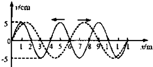 4、选择题 两列简谐横波在同种介质中传播,振幅都是5cm.实线波的频率为2Hz,沿x轴负方向传播;虚线波沿x轴正方向传播.某刻两列波在如图所示区域相遇,则( )