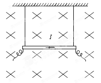 3、计算题 (12分)如图所示,在一个范围足够大、垂直纸面向里的匀强磁场中,用绝缘细线将金属棒吊起,使其呈水平状态. 已知金属棒长L=0. 1m,质量m=0.05kg,棒中通有I=10A的向右的电流,取g =10m/s2.