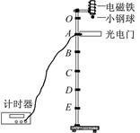 4、实验题 (10分)某同学利用光电传感器设计了测定重力加速度的实验,实验装置如图所示,实验器材有带有标度的竖直杆、光电计时器、小钢球等,小钢球的初始位置与标度O平齐,O、A、B、C、D、E间距相等,竖直杆上端固定一个电磁铁,通电时,小钢球被吸在电磁铁上,断电时,小钢球自由下落,光电门可以在竖直杆上移动.