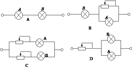 2、选择题  A、B两灯额定电压均为U,额定功率PA<PB,今将A、B两灯接在电压为2U的电路上,要使两灯均正常发光,且符合节能的原则,应选用的电路接法是