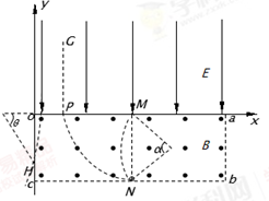 4、计算题 (12分)在如图所示的直角坐标系xoy中,矩形区域oabc内有垂直于纸面向外的匀强磁场,磁感应强度大小为B=5.0×10-2T;第一象限内有沿-y方向的匀强电场,电场强度大小为E=1.0×105N/C.已知矩形区域oa边长为0.60m,ab边长为0.20 m.在bc边中点N处有一放射源,某时刻,放射源沿纸面向磁场中各方向均匀地辐射出速率均为