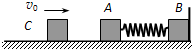 3、选择题 如图所示,质量均为m的物块A、B用轻弹簧相连,放在光滑水平面上,B与竖直墙面紧靠.另一个质量为m的物块C以某一初速度向A运动,C与A碰撞后粘在一起不再分开,它们共同向右运动并压缩弹簧,弹簧储存的最大弹性势能为3.0J.最后弹簧又弹开,A、B、C一边振动一边向左运动.那么