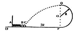 5、计算题 如图所示,光滑轨道的DP段为水平轨道,PQ段为半径是R的竖直半圆轨道,半圆轨道的下端与水平的轨道的右端相切于P点,一轻质弹簧左端A固定,另一端拴接一个质量为m的小球B,质量也为m的小球C靠在B球的右侧,现用外力作用在C上,使弹簧被压缩了0.4R(弹簧仍在弹性限度内)。这时小球静止于距离P端3R的水平轨道上,若撤去外力,C球运动到轨道的最高点Q后又恰好落回到原出发点。已知重力加速度为g。求