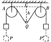 3、简答题 如图所示,细绳绕过两个定滑轮A和B,在两端各挂一个重为P的物体,现在A、B的中点C处挂一个重为Q的小球,Q<2P,求小球可能下降的最大距离h。已知AB的长为2L,不计滑轮和绳之间的摩擦力及绳的质量。?