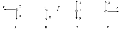 2、选择题 如图所示的各图中,表示通电直导线在匀强磁场中所受磁场力的情况,其中磁感强度B、电流I、磁场力F三者之间的方向关系不正确的是( )