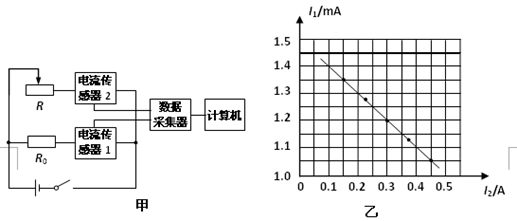 某同学发现上述器材中虽然没有电压传感器,但给出了两个电流传感器,于是他设计了如图甲所示的电路来完成实验。