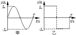 5、选择题 如图所示,正弦波(甲)和方波(乙)交流电的峰值和频率相等,这两个电流分别通过两个完全相同的电阻,则在一个周期的时间里,两个电阻产生的焦耳热之比Q甲:Q乙等于( )