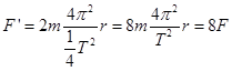 本题解析:根据公式可得质量增大2倍、周期减小到一半时,