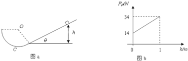 3、简答题 如图a所示,倾角θ=37°的粗糙斜面足够长,其下端与一个光滑的圆弧面相切,圆弧的半径r=0.2m,圆弧的左侧最高点与圆心O等高.在圆弧的最低点C安装有一个压力传感器(也认为光滑且不影响圆弧的平整度和弧度),现从距斜面底端不同高度h处静止释放一小物块(可以看作质点),压力传感器测出的数值与高度h之间的函数图象如图b所示.求: