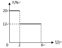 4、计算题 如图,光滑的水平面上有一质量M=4kg足够长的木板,它的中点放一质量m=4kg的小物体,m与M之间的动摩擦因数μ=0.2,且f静max=f滑。开始均静止,从t=0时刻起m受到水平向右、大小如图所示的拉力F作用,当F作用6s时,两物体的位移分别是多少?(g="10" m/s2)