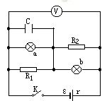 2、选择题  图示的电路中,闭合电键K后,灯a和b都正常发光,后由于某种故障使灯b突然变亮,电压表读数增加,由此推断这故障可能是?