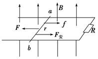 5、选择题 (2009年高考福建理综卷改编)如图9-3-14所示,固定放置在同一水平面内的两根平行长直金属导轨的间距为d,其右端接有阻值为R的电阻,整个装置处在竖直向上磁感应强度大小为B的匀强磁场中.一质量为m(质量分布均匀)的导体杆ab垂直于导轨放置,且与两导轨保持良好接触,杆与导轨之间的动摩擦因数为μ.现杆在水平向左、垂直于杆的恒力F作用下从静止开始沿导轨运动距离l时,速度恰好达到最大(运动过程中杆始终与导轨保持垂直).设杆接入电路的电阻为r,导轨电阻不计,重力加速度大小为g.则此过程( )