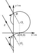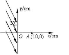 2、计算题 在如图所示的空间区域里,y轴左方有一匀强电场,场强方向跟y轴负方向成30°角,大小为E = 4.0×105 N/C,y轴右方有一垂直纸面的匀强磁场,有一质子以速度υ0 = 2.0×106 m/s由x轴上A点(OA =" 10" cm)先后两次进入磁场,第一次沿x轴正方向射入磁场,第二次沿x轴负方向射入磁场,回旋后都垂直射入电场,最后又进入磁场,已知质子质量m为1.6×10-27 kg,不计质子重力,求: