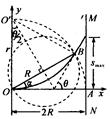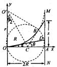 4、简答题 如图所示,磁感应强度大小为B="0." 15 T,方向垂直纸面向里的匀强磁场分布在半径R="0.10" m的圆形区域内,圆的左端跟y轴相切于直角坐标系原点O,右端跟荧光屏MN相切于x轴上的A点。置于原点O的粒子源可沿x轴正方向射出速度=" 3." 0