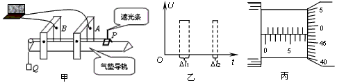 2、实验题 某研究性学习小组利用气垫导轨验证机械能守恒定律,实验装置如图甲所示。在气垫导轨上相隔一定距离的两处安装两个光电传感器A、B,滑块P上固定一遮光条,若光线被遮光条遮挡,光电传感器会输出高电压,两光电传感器采集数据后与计算机相连。滑块在细线的牵引下向左加速运动,遮光条经过光电传感器A、B时,通过计算机可以得到如图乙所示的电压U随时间t变化的图象。
