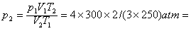初状态:P1=4atm,V1=2V/3,T1=250K