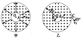(2)若撤去电场,如图乙所示,已知粒子从OA延长线与外圆的交点C以速度V2射出,方向与OA延长线成 45°角,求磁感应强度的大小及粒子在磁场中运动的时间。